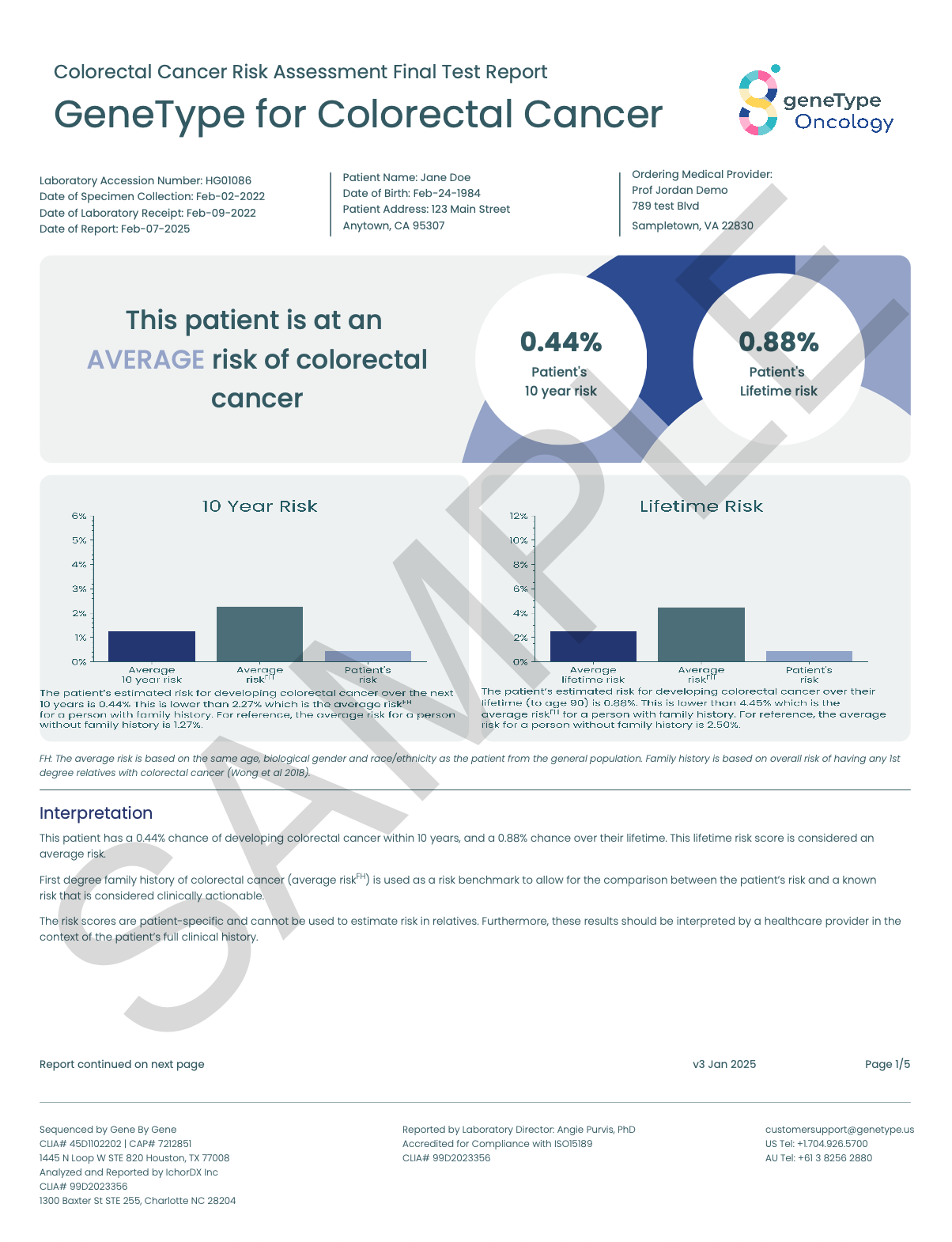 geneType™ for Colorectal Cancer combines several of your risk factors, such as age, family history and your DNA markers, into one comprehensive risk assessment.