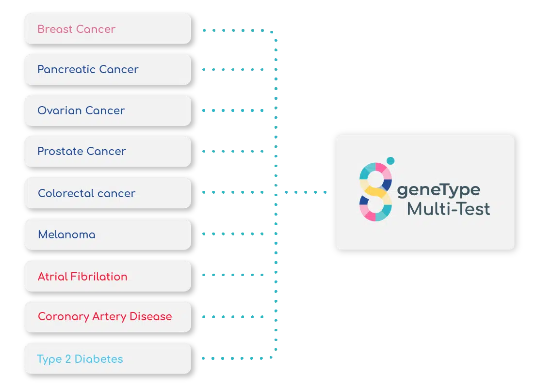 The geneType™ risk assessment works the same way, except we don’t look at a single risk factor, we look at many risk factors together. This gives us a better picture of your risk of developing disease.