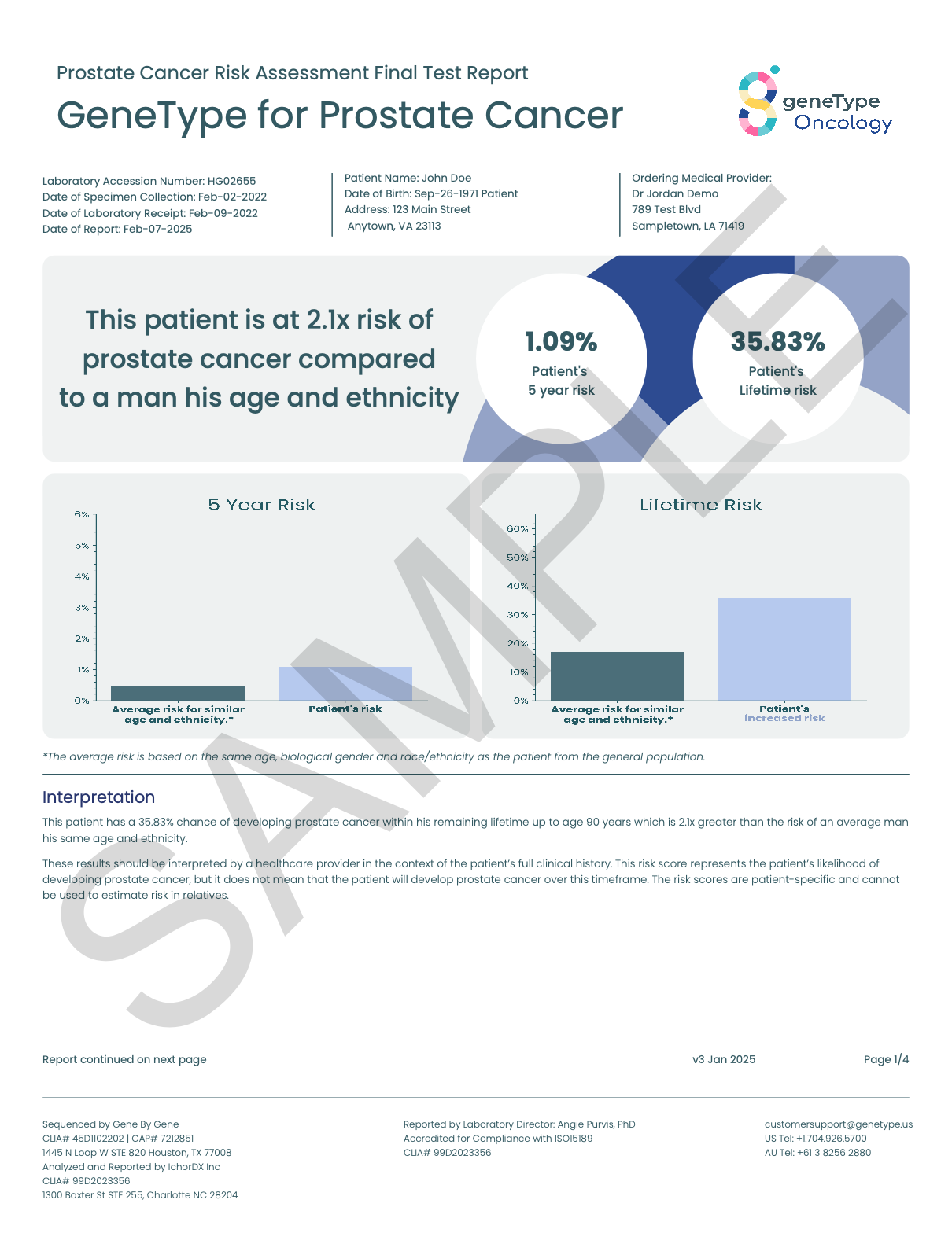 Cancer is a multifactorial disease and there are many different risk factors. Of these, geneType™ integrates the most predictive risk factors into the model. Future models may include additional risk factors as the scientific community’s understanding of prostate cancer continues to evolve.