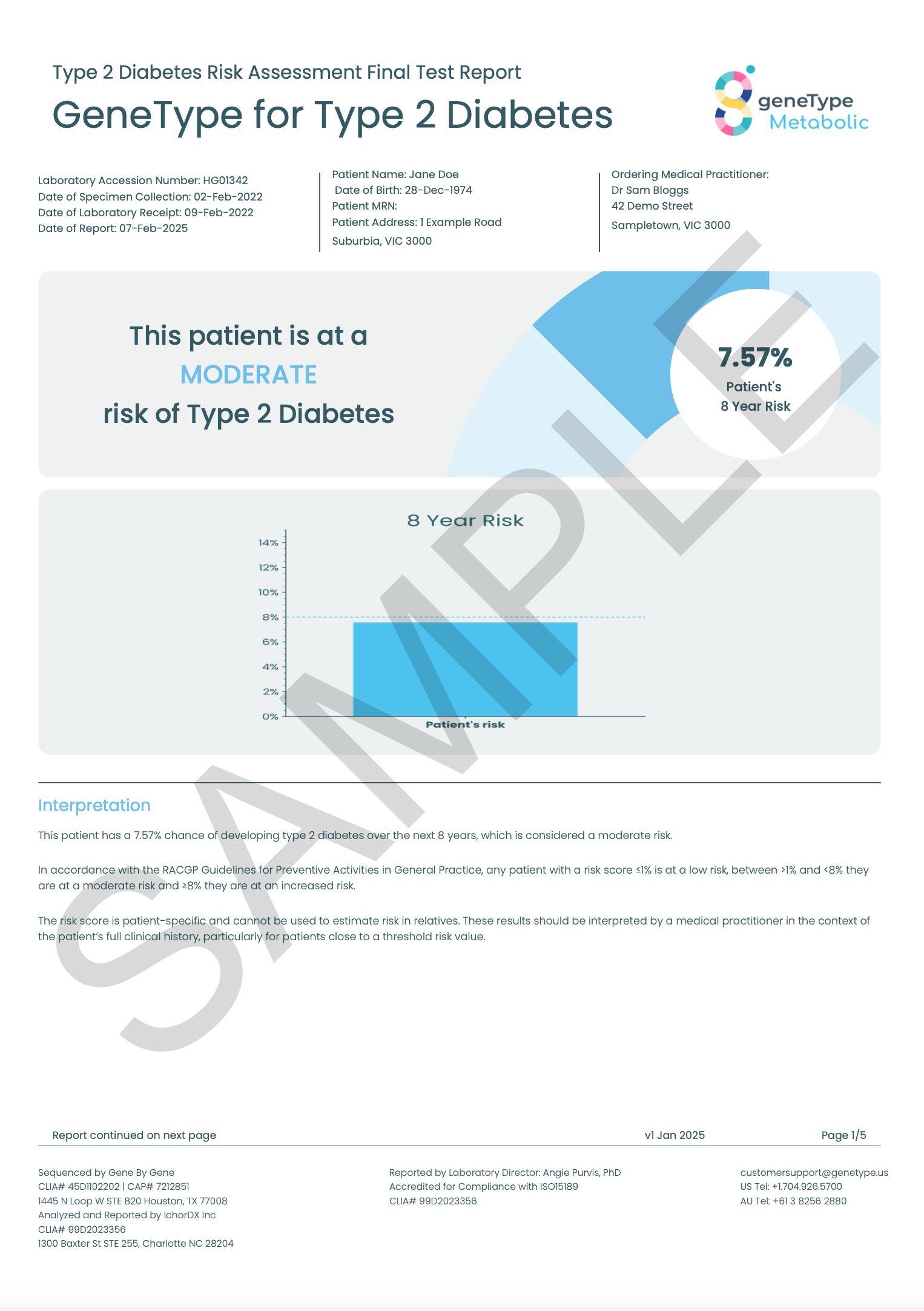Learn more about the geneType™ type 2 diabetes risk test which goes beyond hereditary risk, looking at genetic and clinical risk factors to give you a comprehensive risk prediction so that you can take preventative steps to improve health and mitigate your risk.