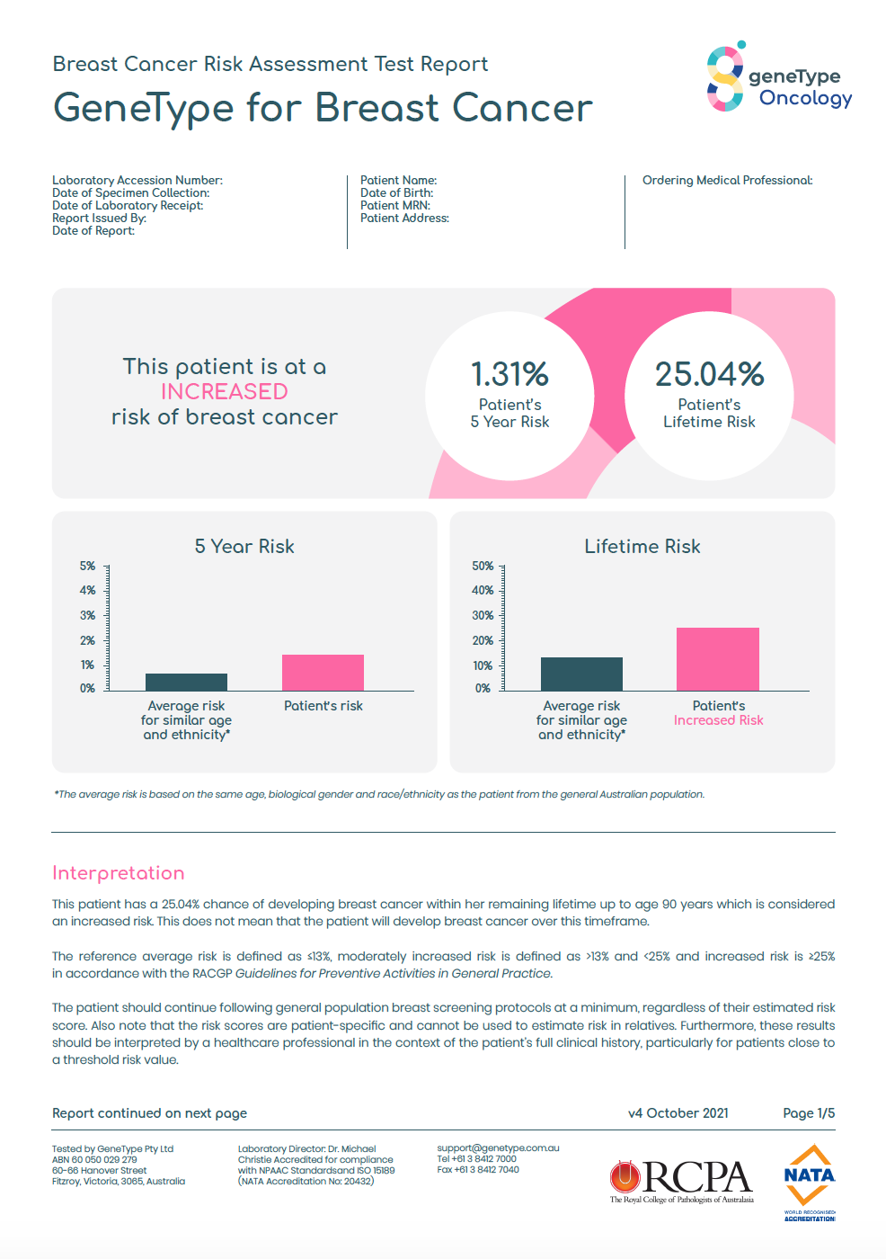 Firstly geneType™ for Breast Cancer tests for the BRCA1, BRCA2 and other HBOC genes. If positive, her results are sent directly to you as the requesting health professional. If her results are negative, geneType™ automatically reflexes to our integrated risk test that combines her clinical, familial and further genetics (70+ single nucleotide polymorphisms or SNPs) to calculate her 5-year and lifetime-risk scores.