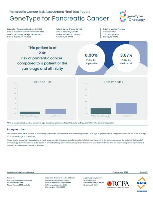 Cancer is a multifactorial disease and there are many different risk factors. Of these, geneType™ integrates the most predictive risk factors into the model. Future models may include additional risk factors as the scientific community’s understanding of pancreatic cancer continues to evolve.